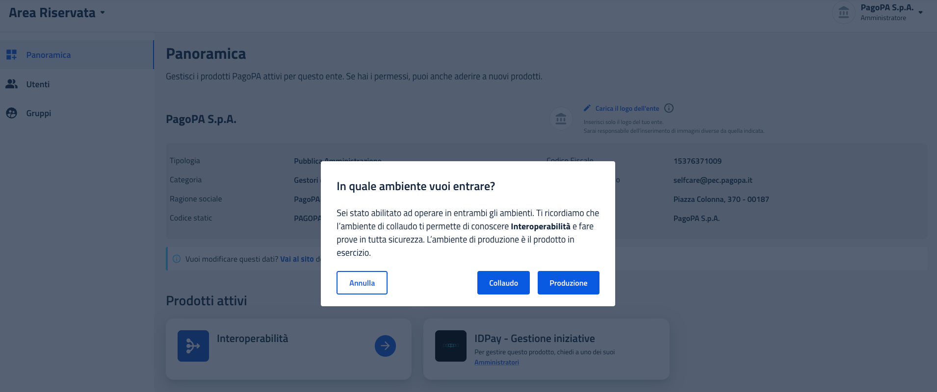 Viene richiesto l'ambiente in cui si intende operare: Collaudo, Attestazione o Produzione.