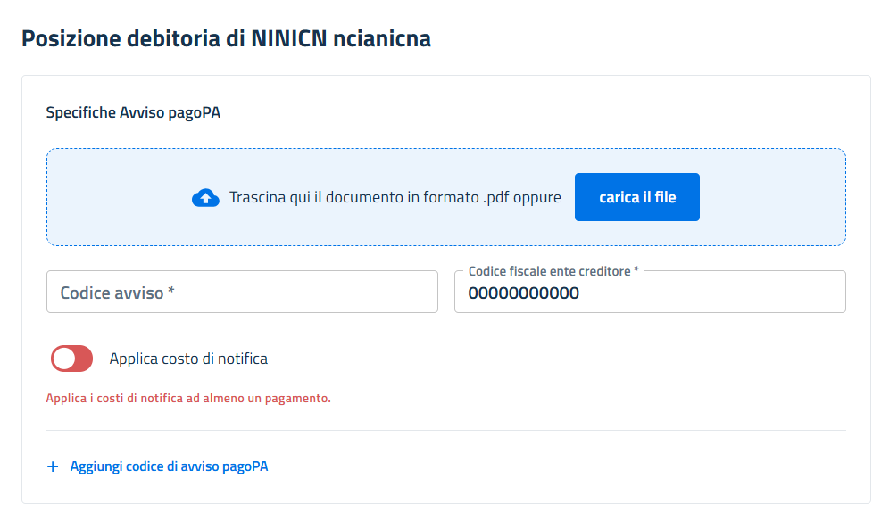 Il campo applyCost valorizzato a true indica che sull'avviso pagoPA devono essere aggiunto l'importo del costo della notifica.