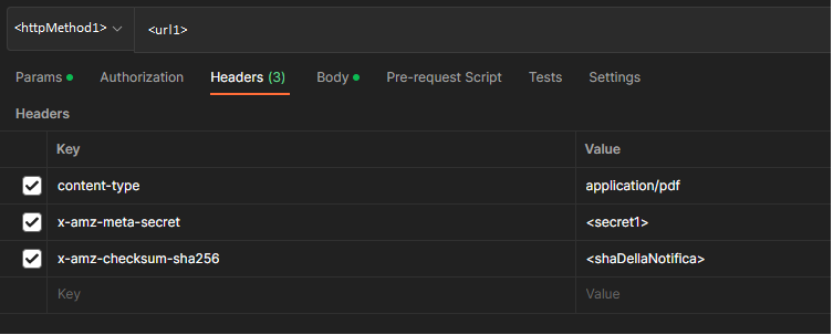 Ora bisogna effettuare l'operazione di upload verso il safeStorage per entrambi i documenti. Cliccando sulle url ottenute, si aprirà una scheda Postman già parzialmente configurata con l'url di interesse. Sarà ora necessario compilare gli headers nella sezione "Headers" inserendo i parametri ottenuti nella precedente chiamata: