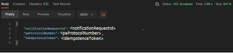<paProtocolNumber> e <idempotenceToken>: questi campi sono gli stessi che sono stati inseriti nella precedente richiesta di inserimento Notifica e potranno essere utilizzati, in modo alternativo al <notificationRequestId> ed insieme tra loro, per conoscere lo stato di accettazione della notifica su Piattaforma Notifiche.
