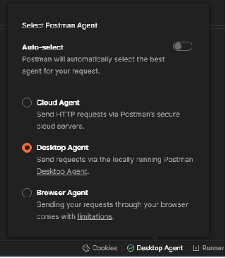 NOTA: avendo 2 documenti, le chiamate da effettuare per effettuare l'upload sono 2, pertanto sarà necessario utilizzare i riferimenti <url1>, <httpMethod1> e <secret1> nella chiamata di caricamento del primo file e <url2>, <httpMethod2> e <secret2> nella chiamata di caricamento del secondo file. Per effettuare questa chiamata sarà necessario selezionare il "Desktop Agent" di Postman, dalla sezione dedicata in basso.