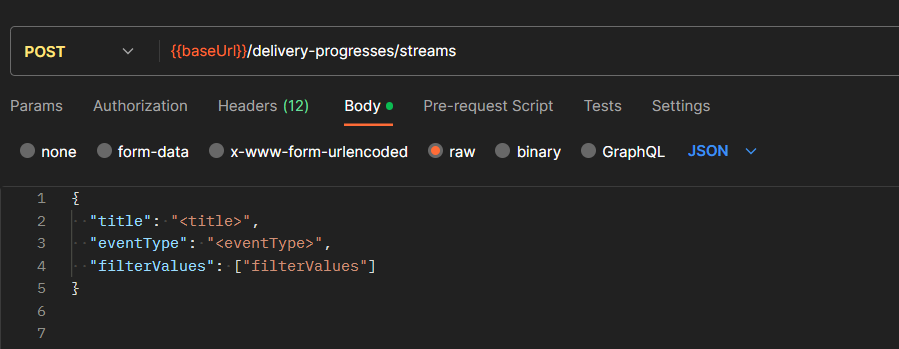 Aprire la scheda Crea nuovo stream di eventi ed inserire nel body il seguente payload: