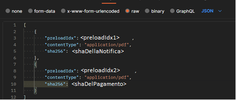 - <payloadDellaNotifica>: corrisponde al json contenente tutti i dati della notifica; per inserire correttamente i riferimenti ai pdf caricati in precedenza, seguire le seguenti istruzioni: