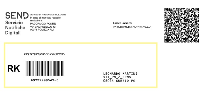 Il nuovo elemento in timeline ha lo scopo di veicolare al mittente la copia conforme digitale e firmata da PagoPA in formato PDF della stampa della AAR effettuata dal consolidatore. Questo PDF rispecchia in modo fedele la stampa del foglio inviato che consta nell'AAR al quale il consolidatore aggiunge le informazioni per il recapito in posizione tale da essere visualizzati nella finestrella della busta, i riferimenti del numero di raccomandata e i codici a barre utilizzati nel processo di recapito.