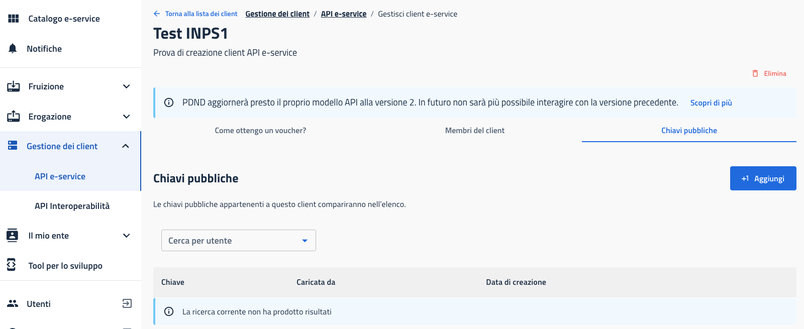 Seleziona la voce di menu Gestione dei Client -> API e-service, accedere al tab "Chiavi pubbliche" e cliccare sul pulsante "+1 Aggiungi"
