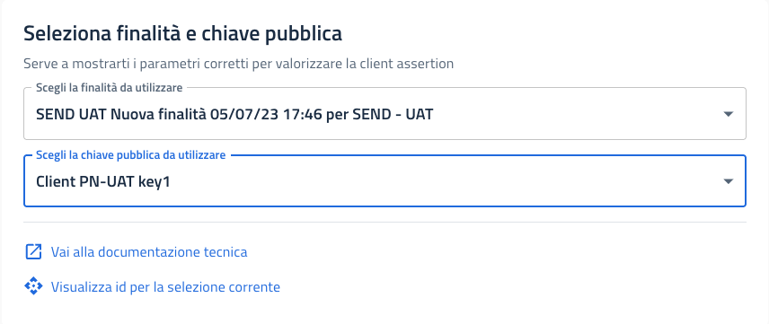 A questo punto è necessario generare il Voucher da inserire come Authorization header nelle chiamate verso i servizi B2B di SEND - UAT. Per prima cosa selezionare il client creato dalla pagina Gestione dei Client -> API e-service e seguire la procedura guidata.
