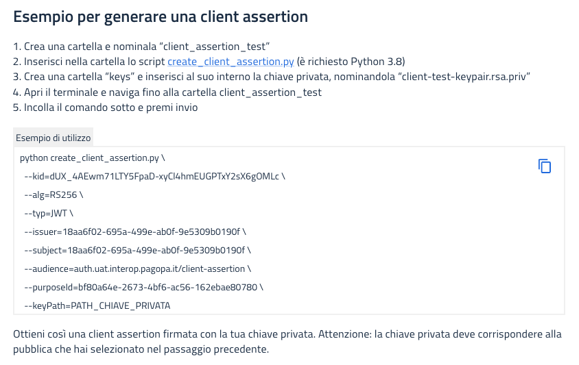 2) Client assertion: Cliccando sul pulsante "Avanti" vengono mostrati tutti i parametri per la creazione della client assertion e un esempio di script per la generazione: