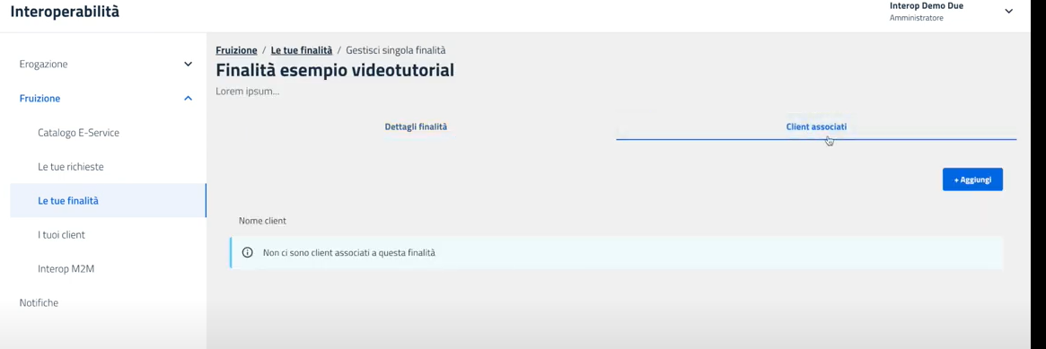 Una volta creato un client, sarà possibile associarlo ad una finalità, entrando in Fruizione > Finalità inoltrate, poi nel tab "Client associati" cliccare su "+1 Aggiungi"