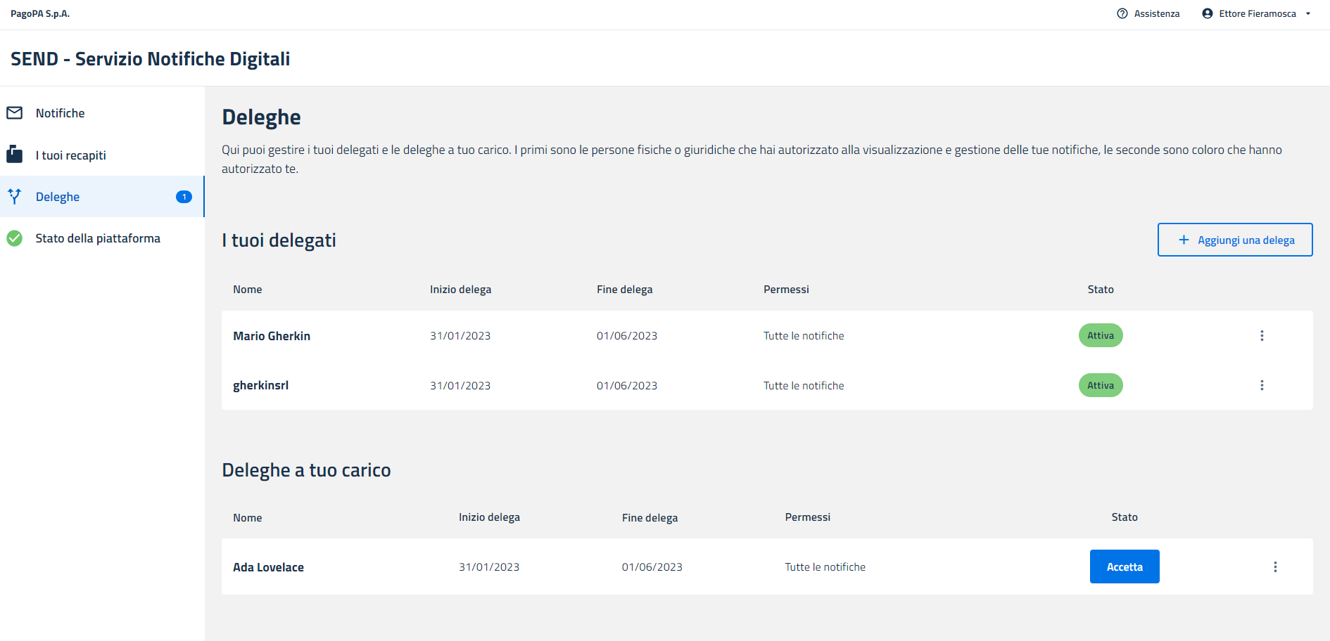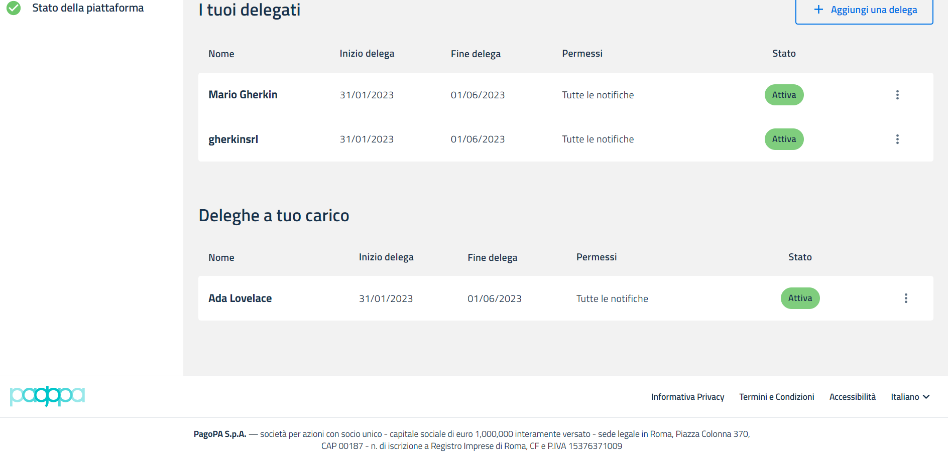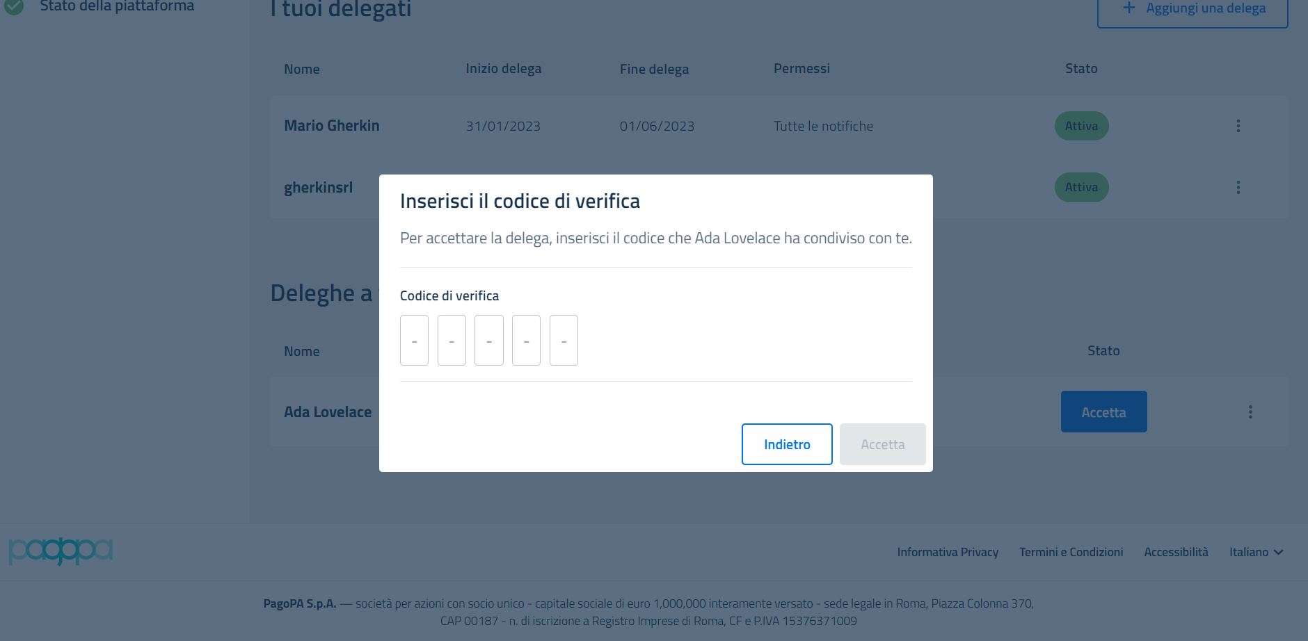 Nel caso in cui il codice sia corretto, la delega transita nello stato “attiva”.