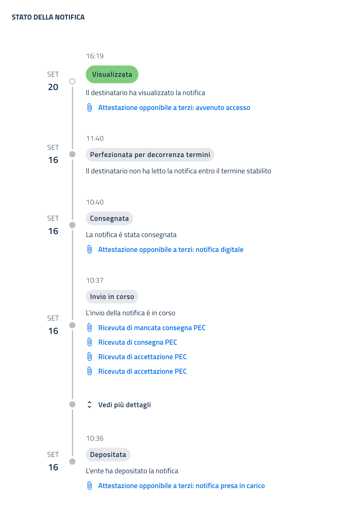 La timeline presenta inizialmente solamente gli eventi che determinano un cambiamento di stato della notifica. Eventi secondari (esempio i diversi tentativi di invio di una PEC) sono disponibili aprendo le sezioni “Mostra di più”. Eventuali documenti collegati agli eventi secondari sono disponibili anche attraverso i link presenti negli eventi principali.