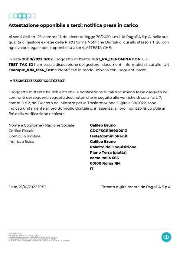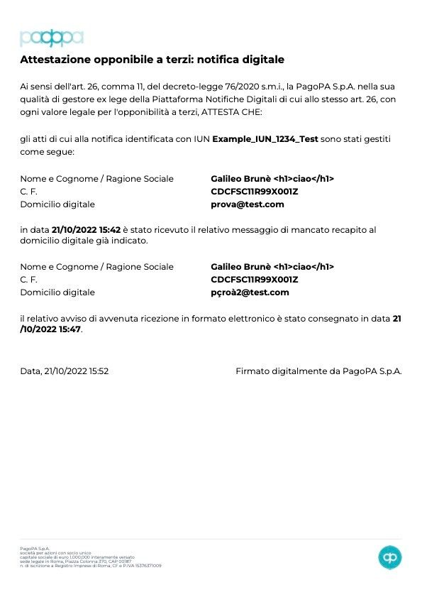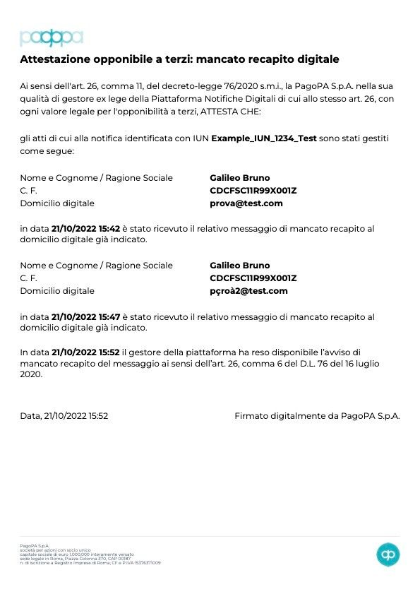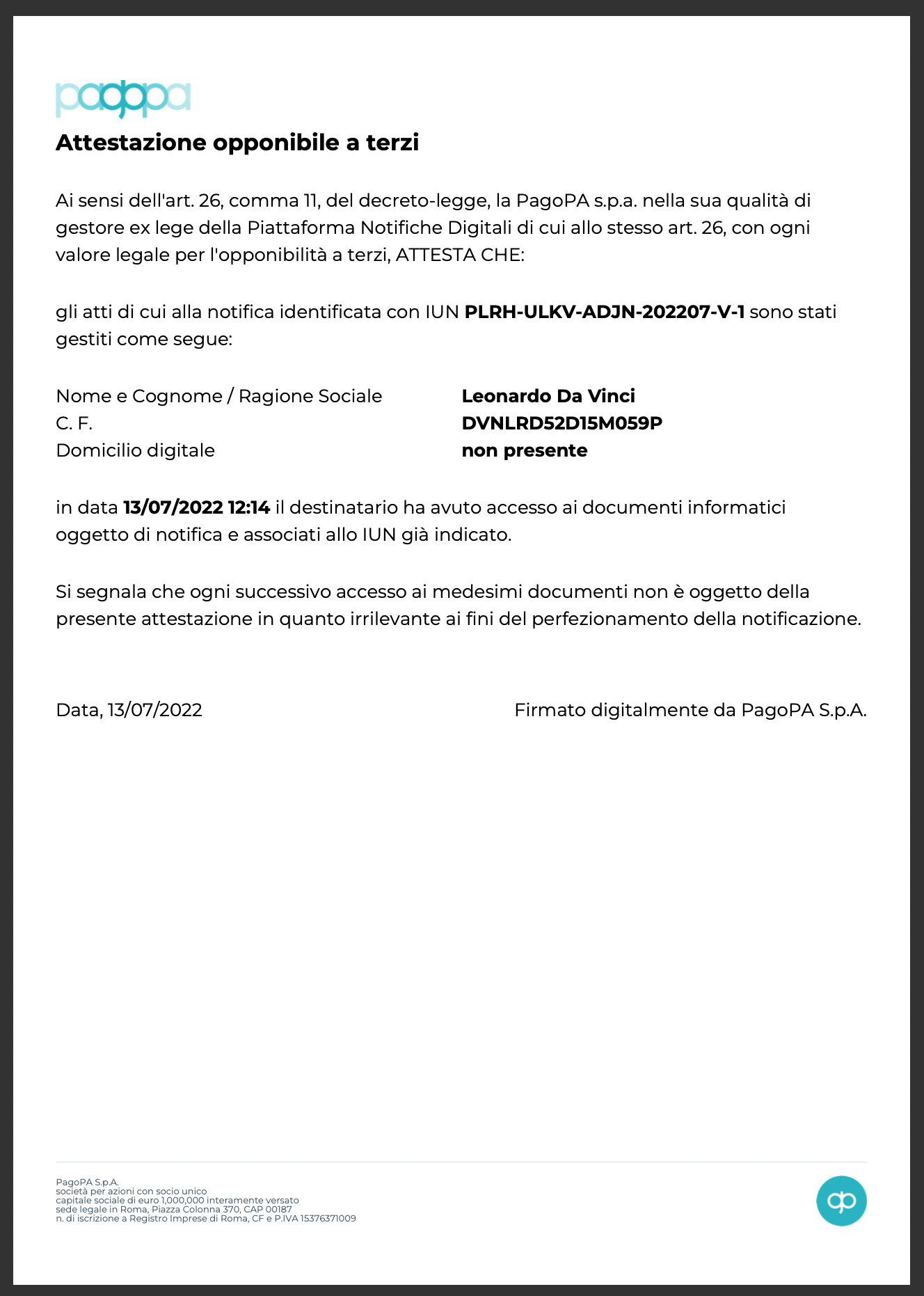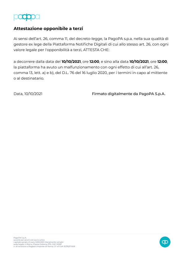 Le attestazioni opponibili ai terzi sono dei file in formato PDF, firmati digitalmente da PagoPA con Sigillo Digitale Qualificato così come definito dal CAD e dotati di marcatura temporale certificata. Queste caratteristiche garantiscono l’irripudiabilità e l’immodificabilità delle attestazioni.