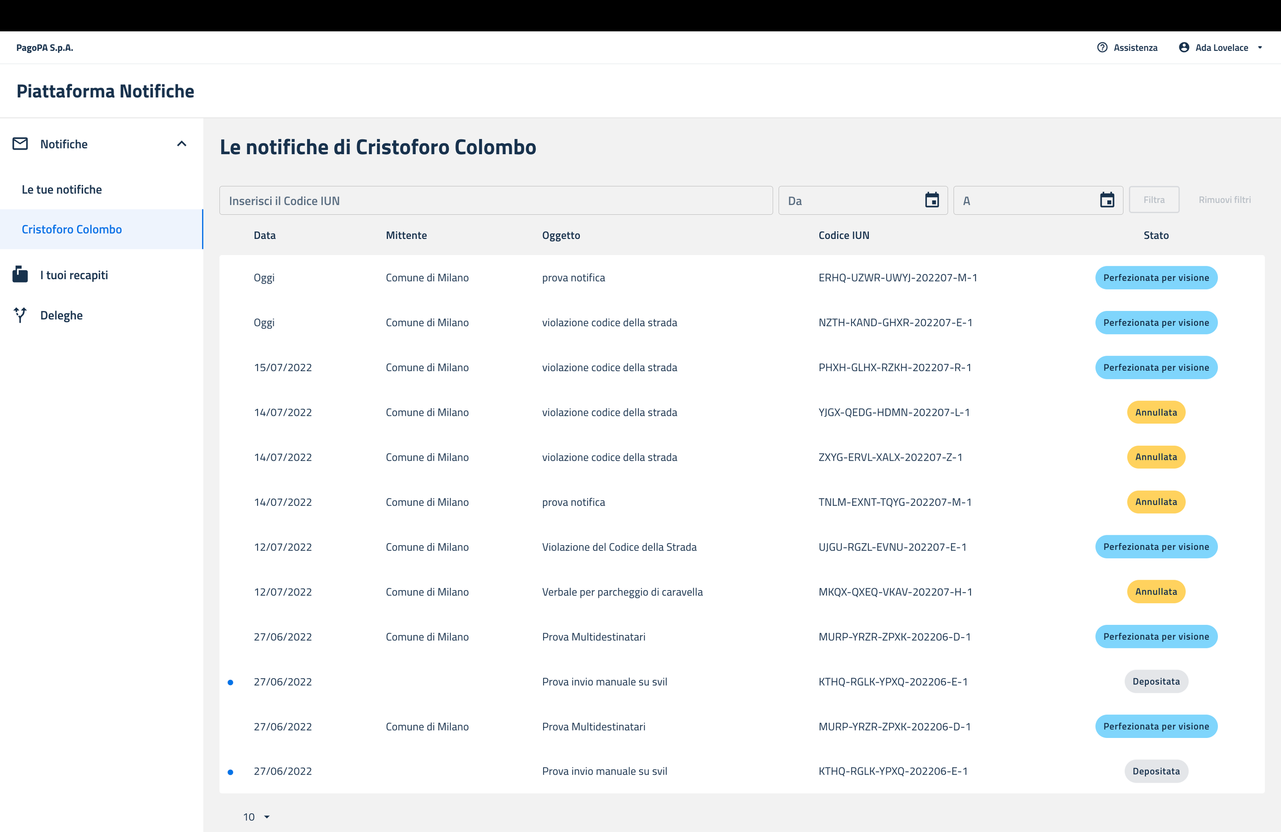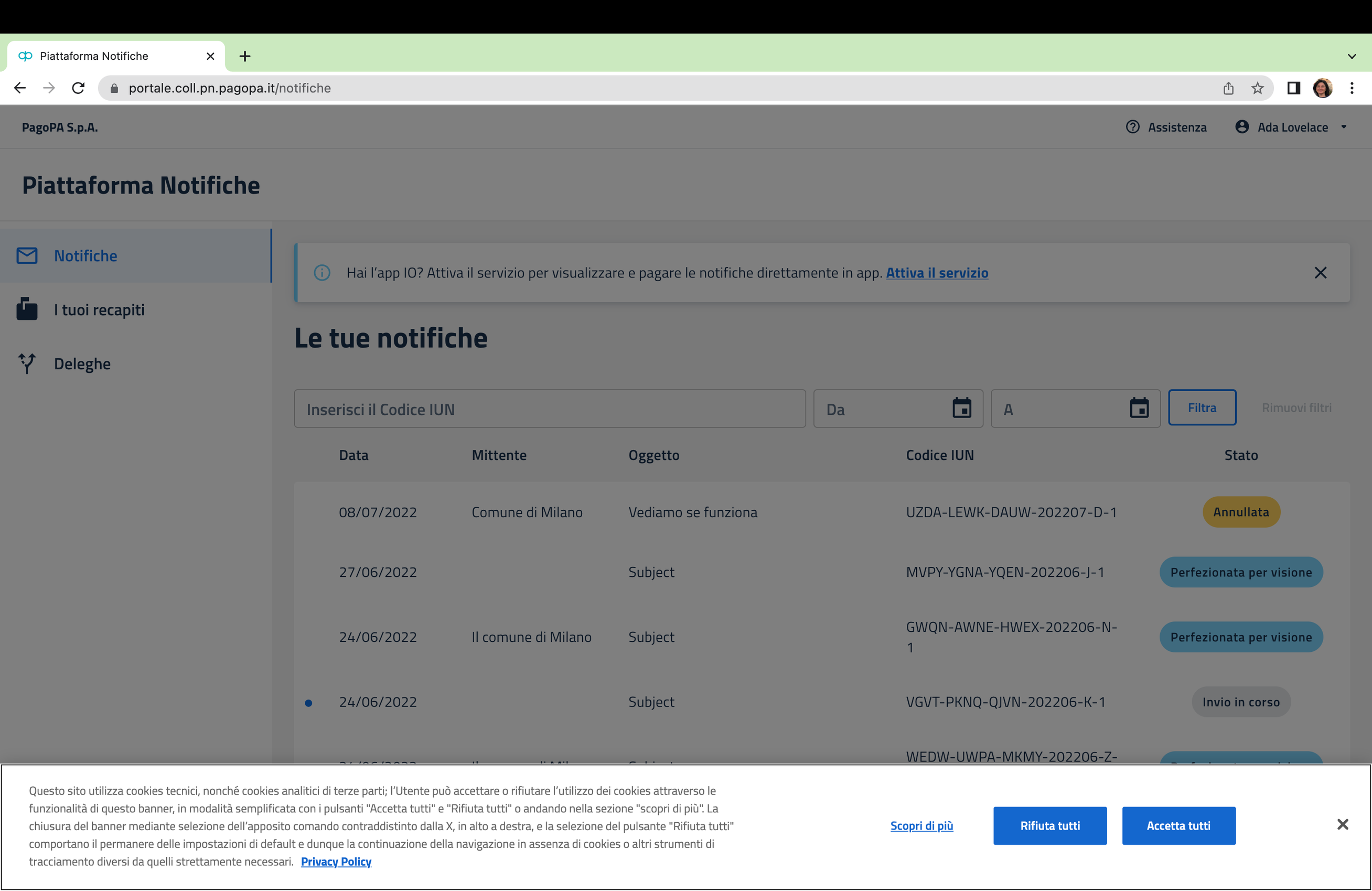L’utente ha così accesso all’Area Piattaforma Notifiche per gestire le proprie notifiche ed eventualmente quelle a lui delegate. Ha anche la possibilità di configurare i propri recapiti digitali.\