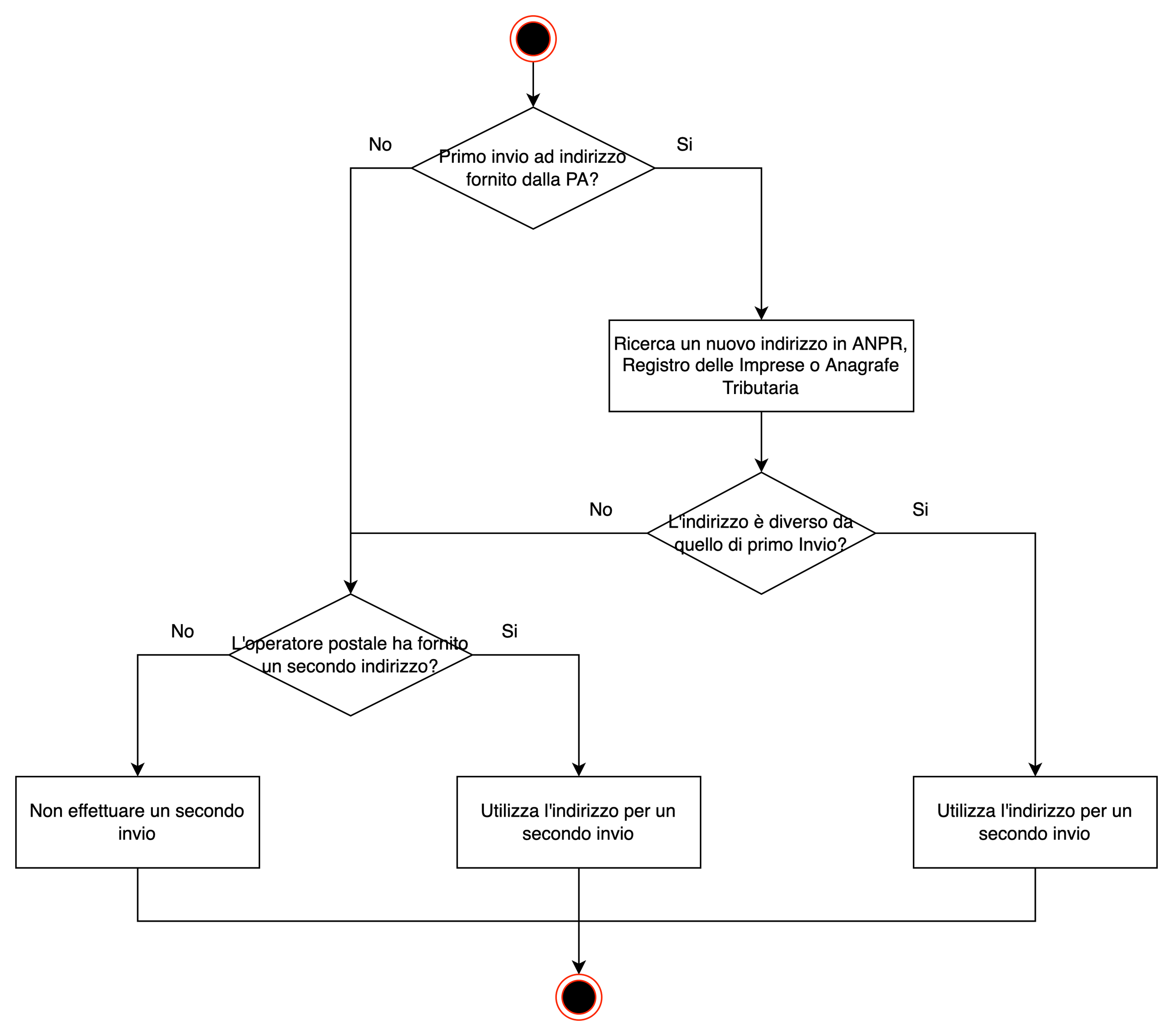 Nel caso in cui il destinatario sia irreperibile all’indirizzo fisico fornito, l’operatore postale tenta di determinare un secondo indirizzo fisico di inoltro che viene fornito a PN. PN cerca a questo punto di determinare un secondo indirizzo di spedizione con le seguenti modalità: