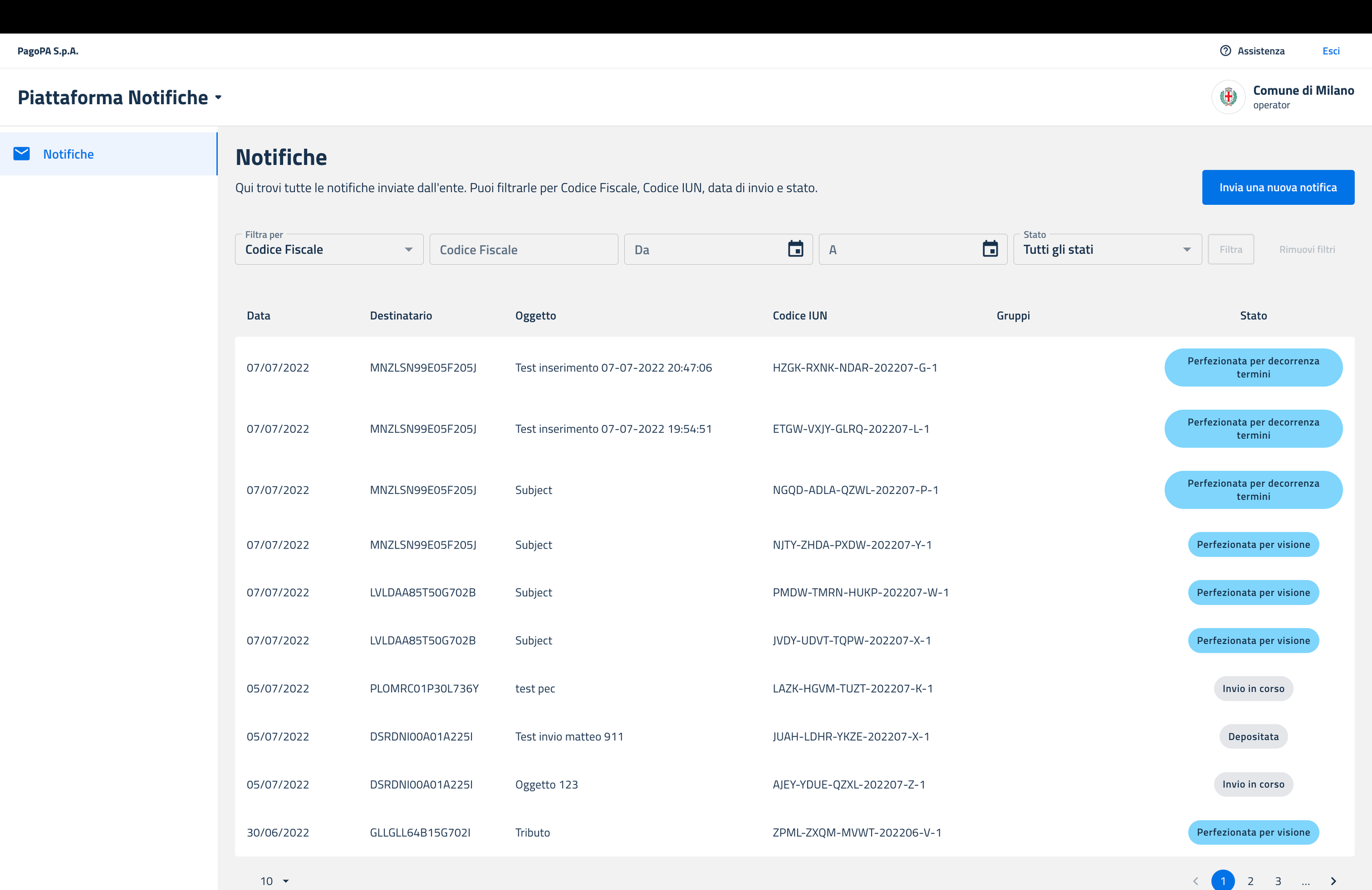 La visualizzazione mostra le notifiche, a partire dalla più recente, in forma tabellare con indicazioni relative a: data di invio della notifica, Codice Fiscale destinatario/i, oggetto della notifica, codice IUN, gruppi (se etichettata) e stato della notifica.