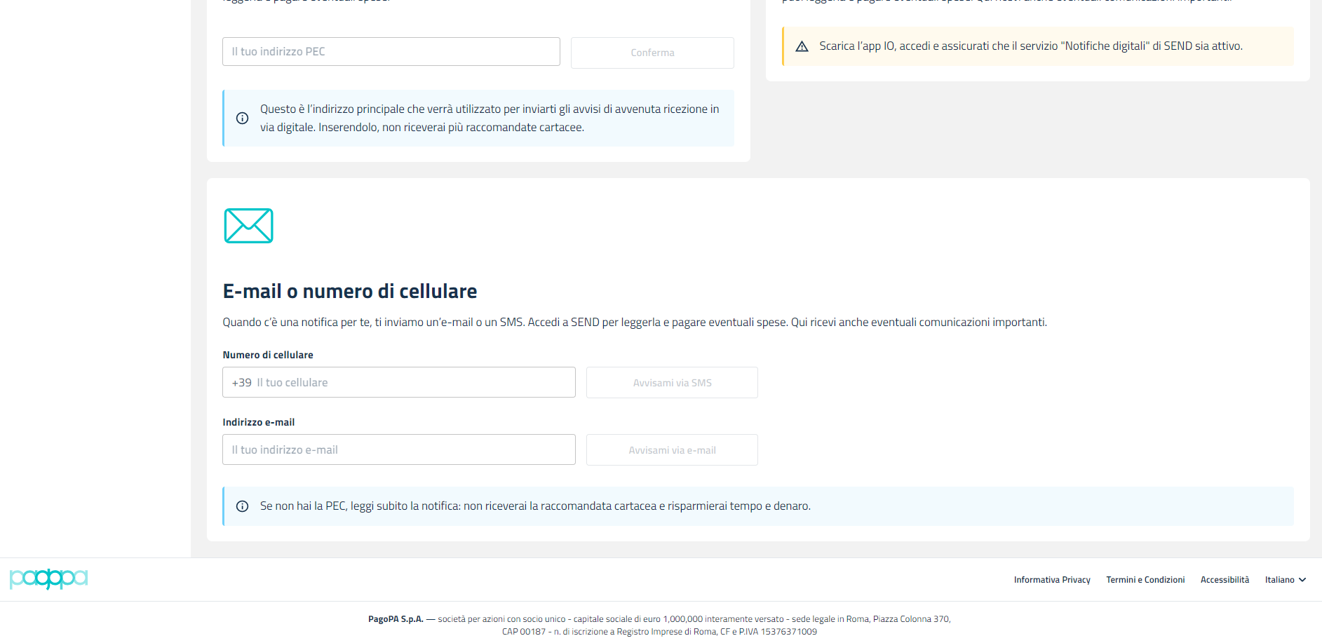 Aggiunta di un recapito digitale "Email o SMS"