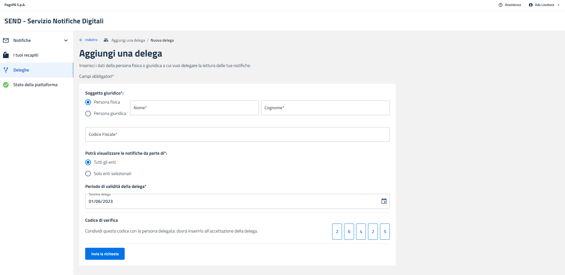 Premendo il tasto “Aggiungi una delega”, l’utente crea una nuova delega.