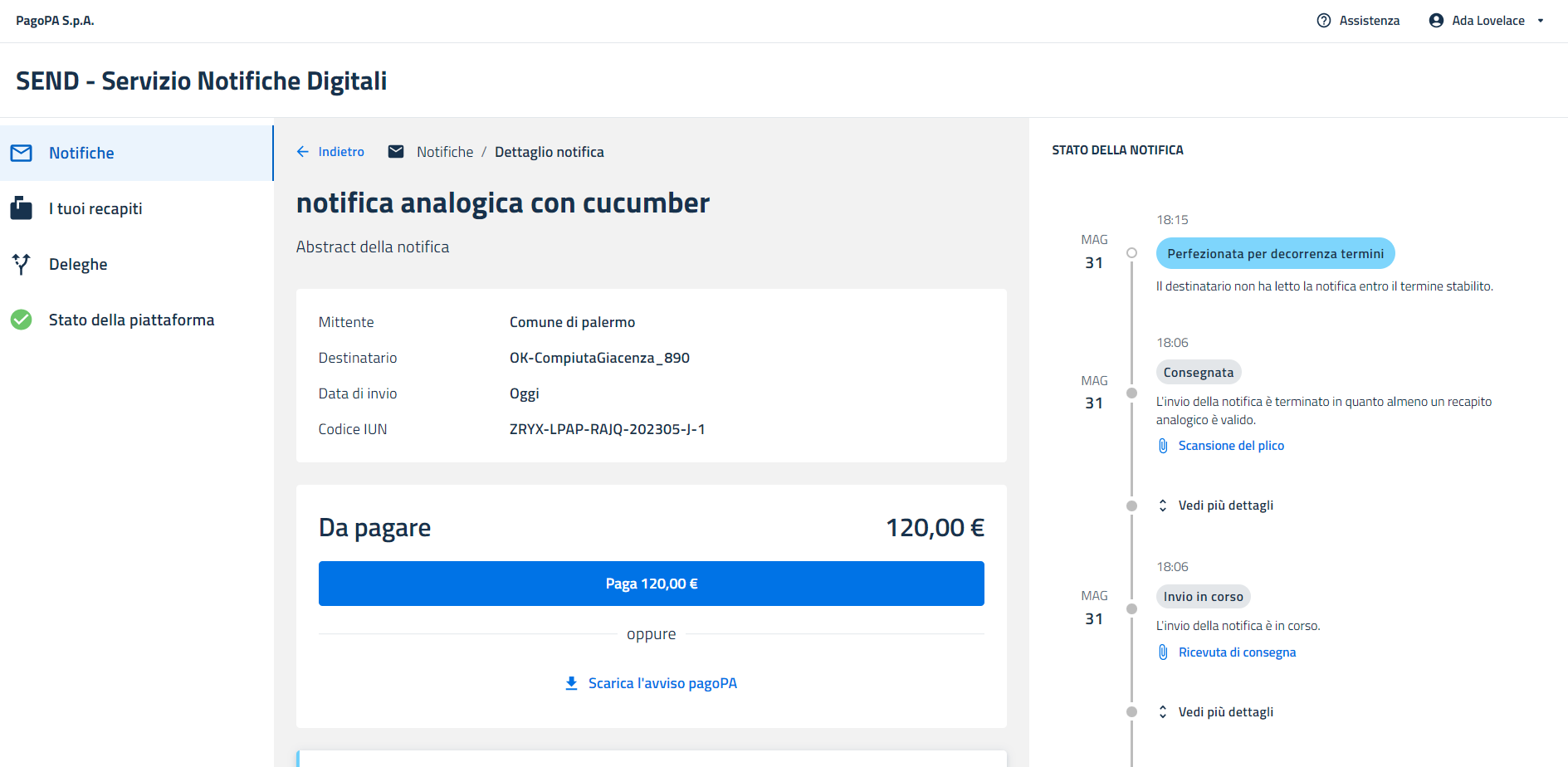 E' anche possibile utilizzare l’avviso pagoPA o l’F24 allegati alla notifica per effettuare il pagamento attraverso canali diversi da quelli online offerti da PN. In questo caso non verrà aggiunta alla notifica un evento di avvenuto pagamento ed il bottone rimarrà abilitato fino a quando l’utente non entrerà nella notifica attraverso il portale o appIO successivamente all’avvenuto pagamento e, nel caso dell’F24, successivamente alla chiusura della posizione debitoria da parte della PA mittente.