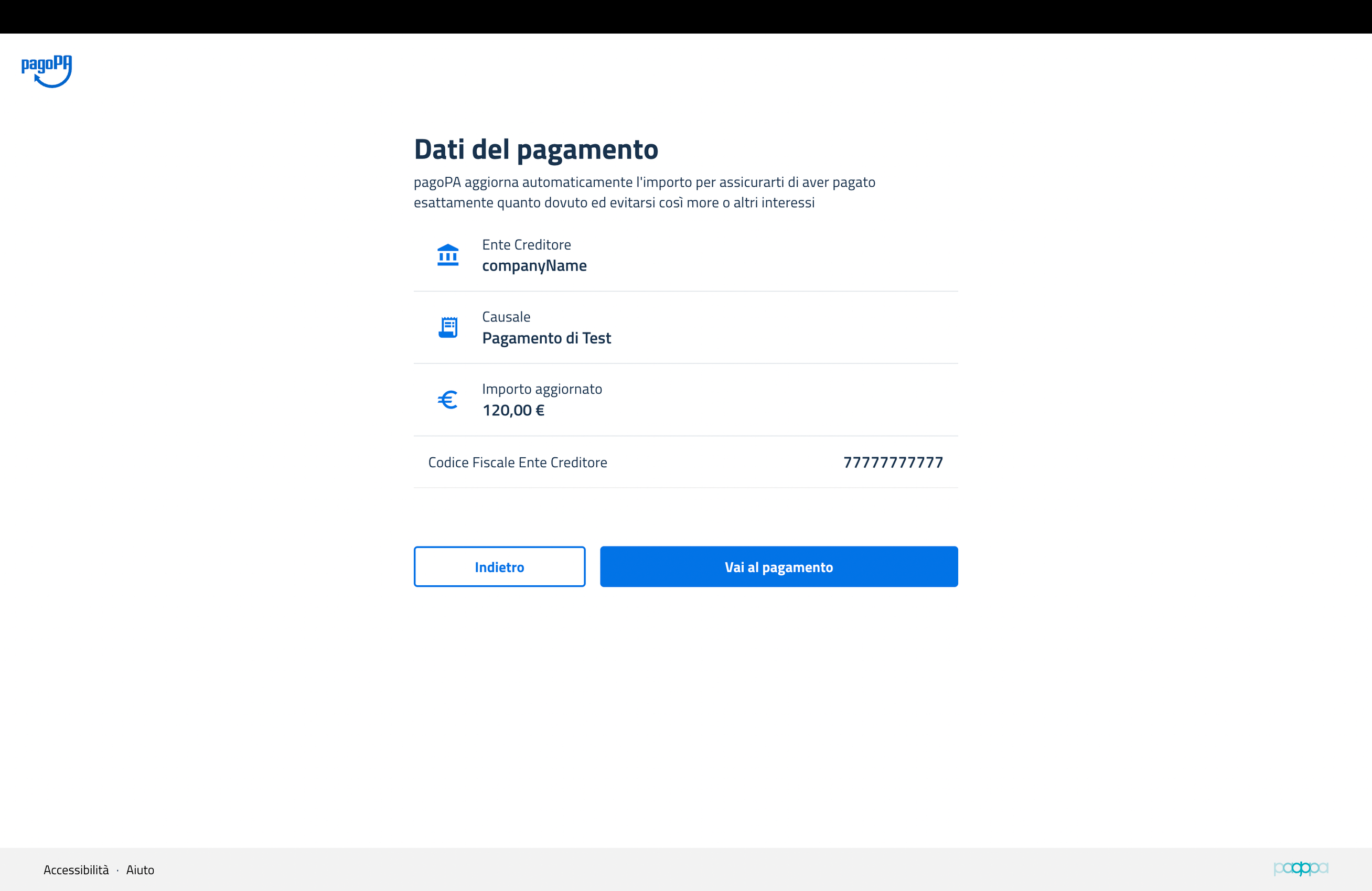 L’utente viene così indirizzato su una schermata dove sono già caricati tutti i dati necessari per procedere con il pagamento, il percorso è quello utilizzato da pagoPA per ogni altro tipo di pagamento.
