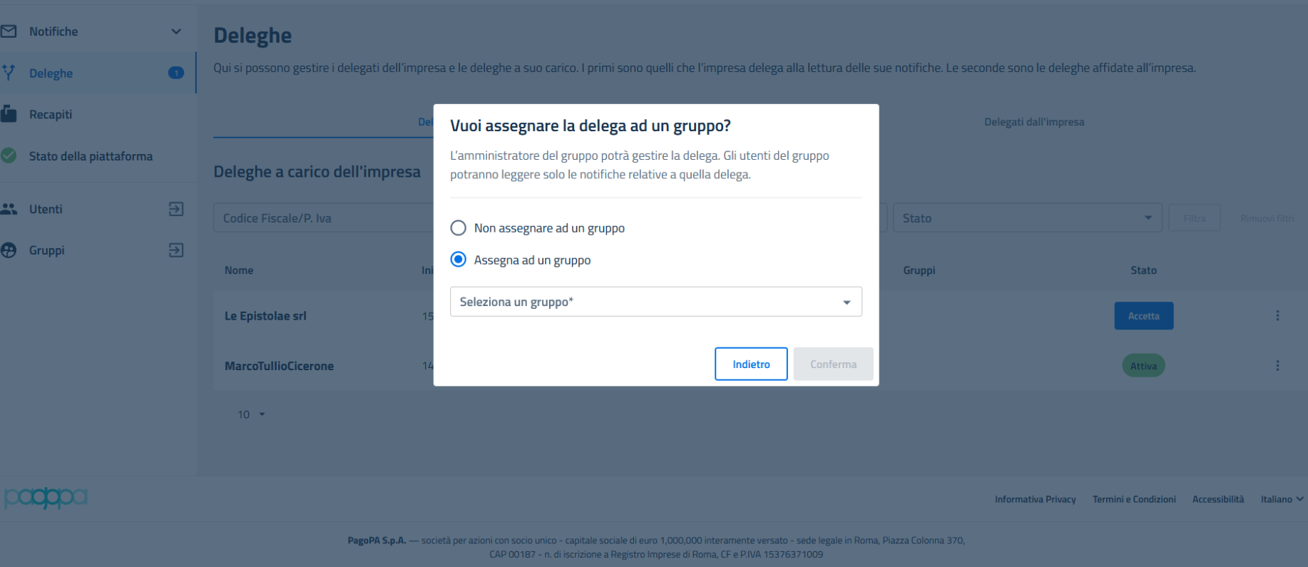 - Solo gli utenti amministratori possono accettare deleghe. All’atto dell’accettazione, una delega può essere associata ad un gruppo. In questo caso le notifiche verranno visualizzate solo dagli utenti che fanno parte del gruppo al quale la delega è associata. La delega potrà poi essere gestita da un amministratore di gruppo, altrimenti dovrà essere gestita da un amministratore.
