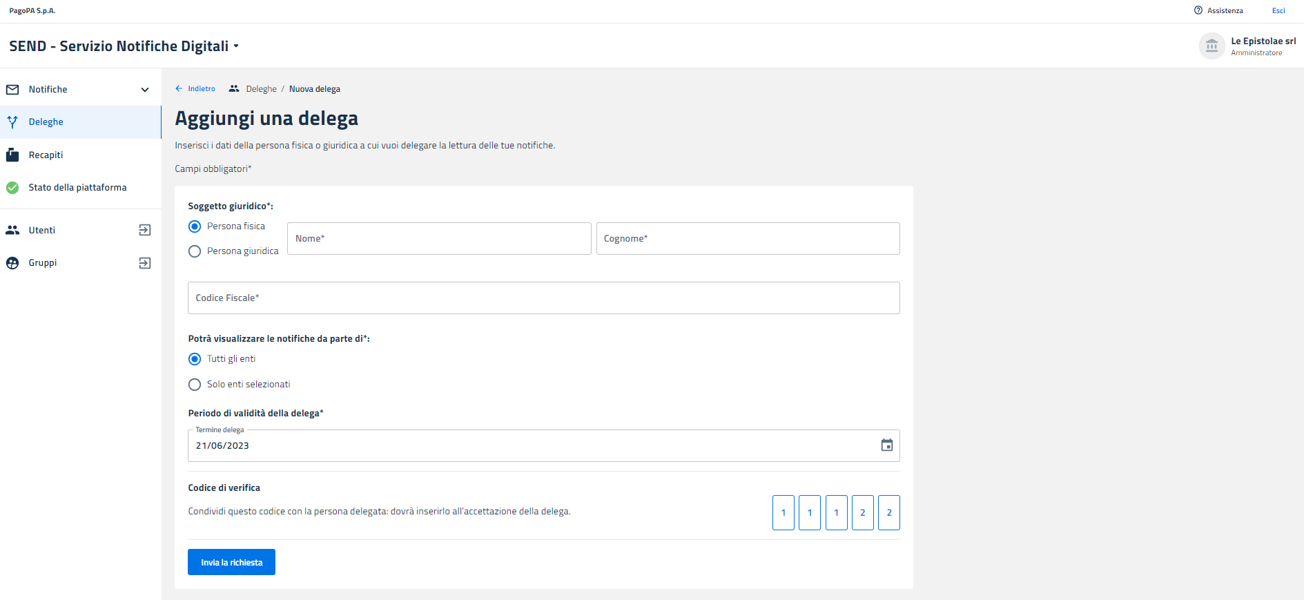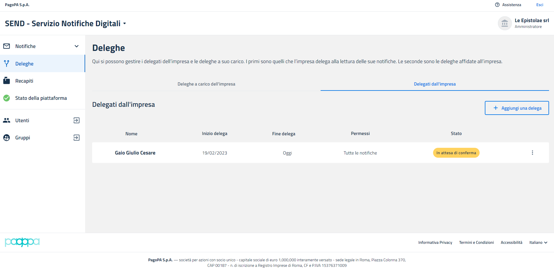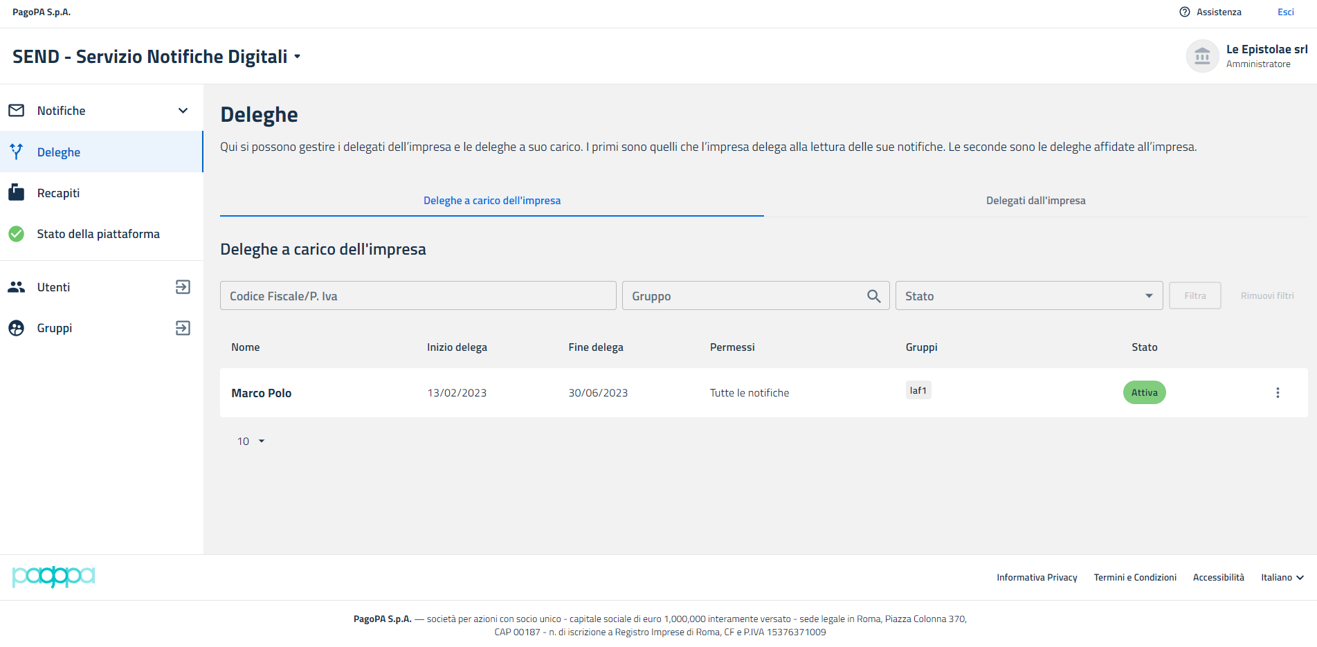 - Solo gli utenti amministratori possono creare e gestire deleghe nelle quali la persona giuridica è parte delegante;