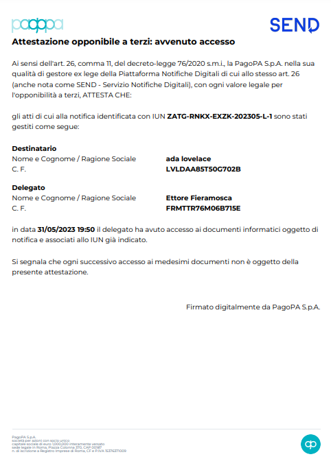 Questa Attestazione viene generata quando l'accesso per conto del destinatario delegante alla notifica avviene (secondo le modalità previste) da parte di un delegato; ed è associata allo stato della notifica "Avvenuto Accesso".