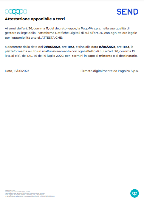 Le attestazioni opponibili ai terzi sono dei file in formato PDF, firmati digitalmente da PagoPA con Sigillo Digitale Qualificato così come definito dal CAD e dotati di marcatura temporale certificata. Queste caratteristiche garantiscono l’irripudiabilità e l’immodificabilità delle attestazioni. Tali attestazioni sono conservate a norma per 10 anni.