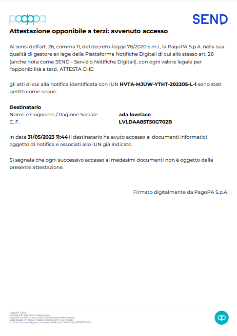 Questa attestazione viene generata quando il destinatario accede alla notifica (secondo le modalità previste) ed è associata allo stato della notifica "Avvenuto Accesso"