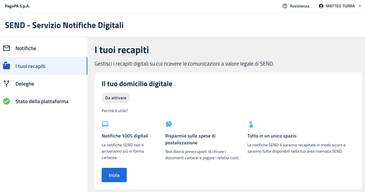 PN consente ai Destinatari persone fisiche di configurare un proprio domicilio digitale (ovvero, una PEC o un SERCQ), nella sezione “Il tuo domicilio digitale”che sarà utilizzato in via preferenziale per la notificazione da parte di PN degli atti provenienti dalle PA mittenti aderenti alla stessa PN.