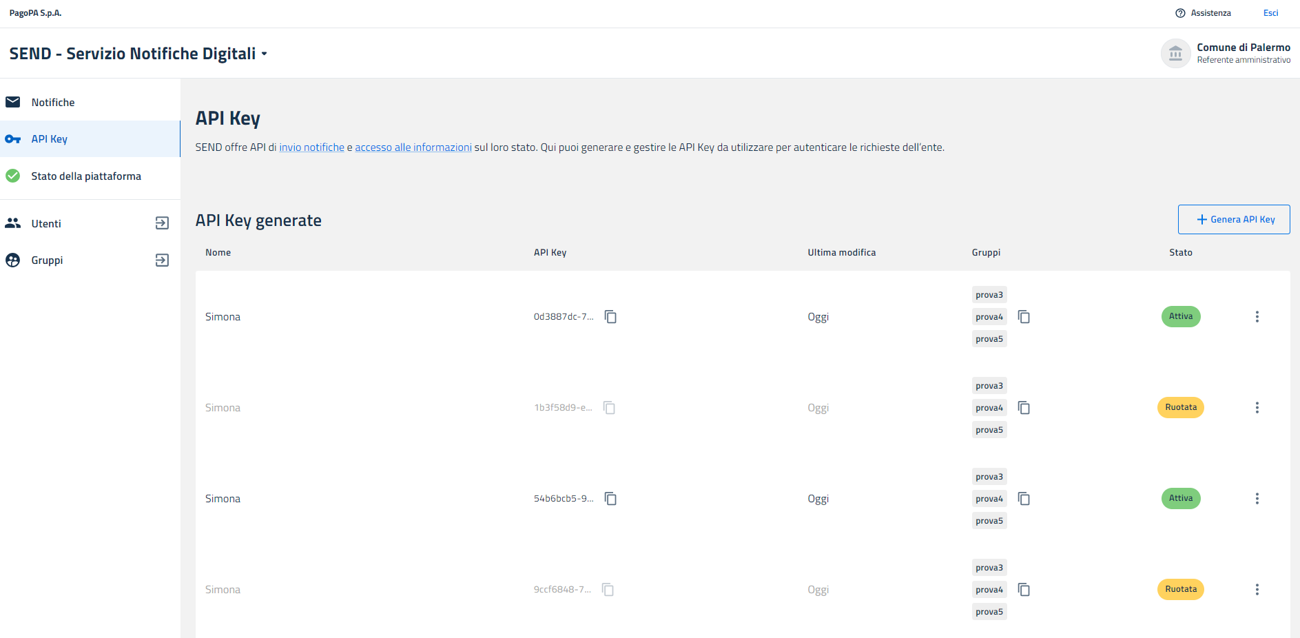 La pagina mostra la lista delle API Key già configurate dalla PA e che sono etichettate con gruppi ai quali l’utente appartiene.