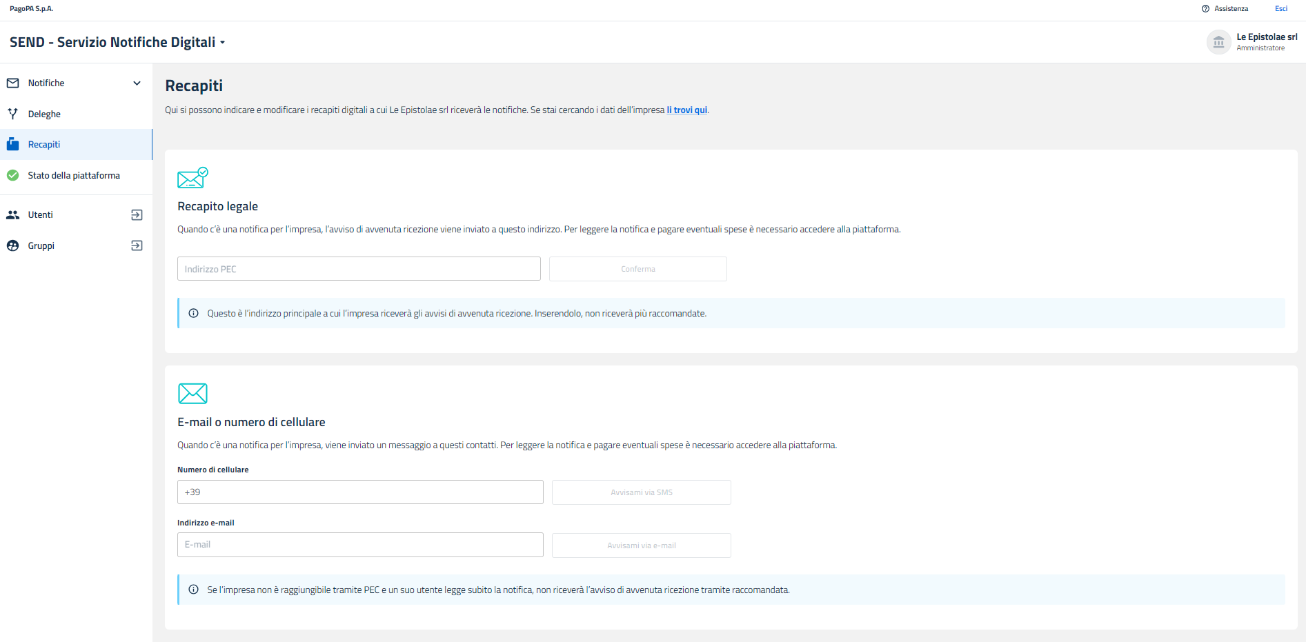 Utenti amministratori configurano domicili e recapiti digitali con le stesse modalità descritte nella sezione Persone fisiche.