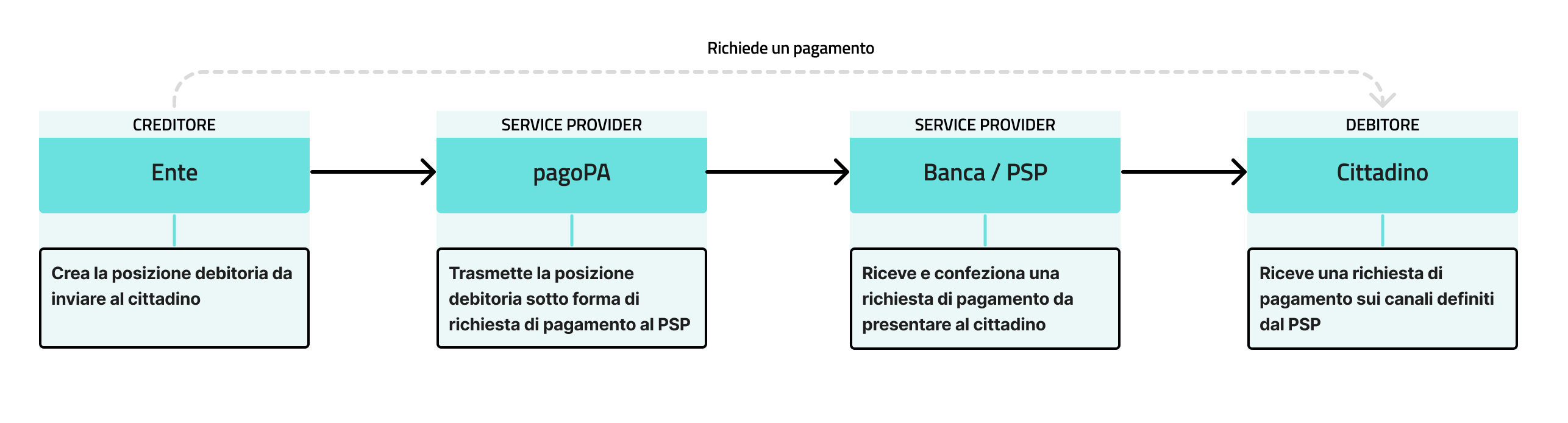 Questo modello consente a un creditore, come un Ente della Pubblica Amministrazione, di inviare una richiesta di pagamento a un debitore, attraverso i canali di un Service Provider, come una banca o un istituto di pagamento.