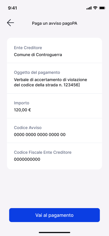 - Riportare i campi necessari per il pagamento tramite avviso pagoPA, ovvero: Ente creditore, Oggetto del pagamento, Importo, Codice Avviso, Codice Fiscale Ente creditore, Totale da pagare