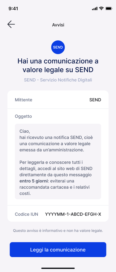 - É fondamentale veicolare correttamente il messaggio all'utente: quello che sta visualizzando è il messaggio di cortesia e NON la comunicazione a valore legale. Per leggere quest'ultima dovrà accedere a SEND.