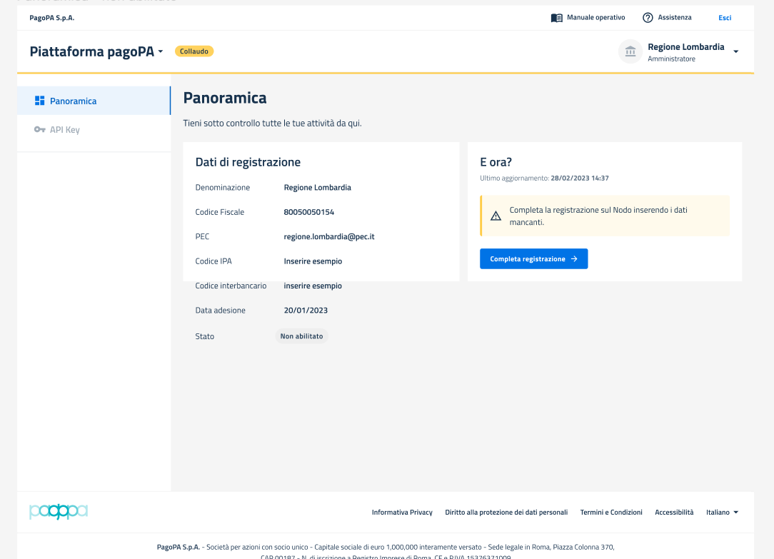 Nel caso in cui non è stata ancora effettuata la registrazione al Nodo dei Pagamenti lo Stato risulta in "Non Abilitato".