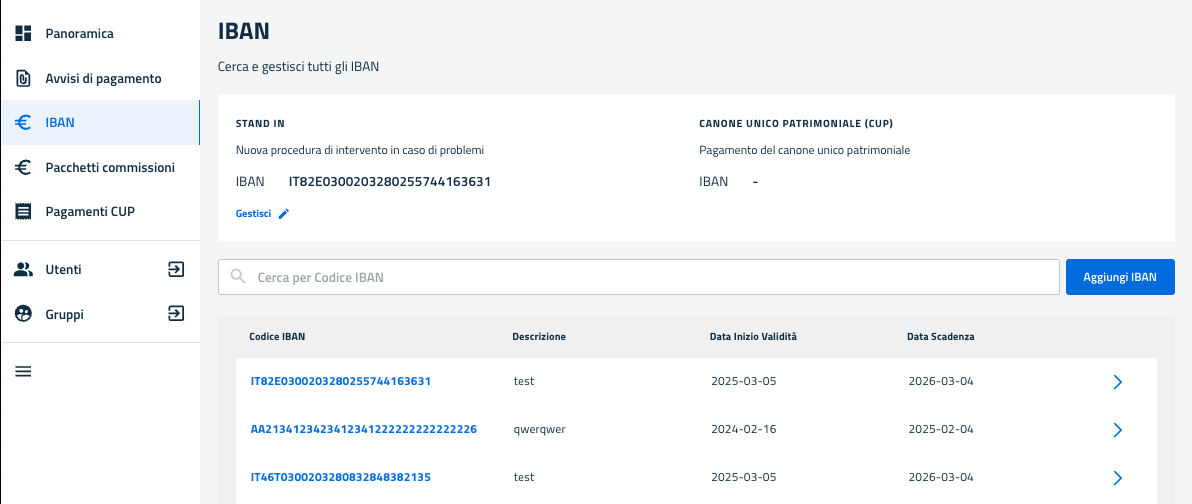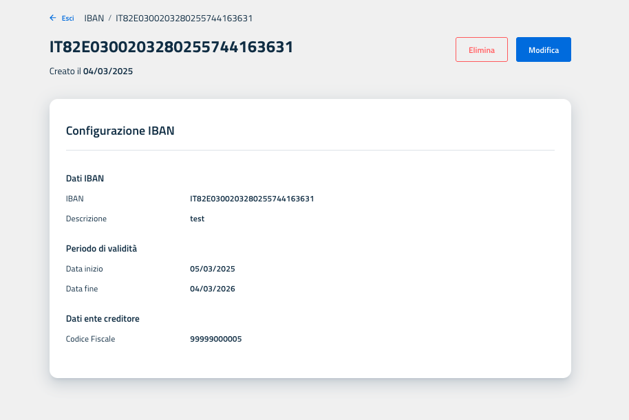 All'interno di tale pagina è possibile visualizzare tutti i dati relativi all'IBAN inseriti in fase di creazione.