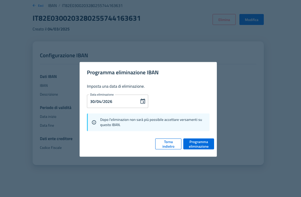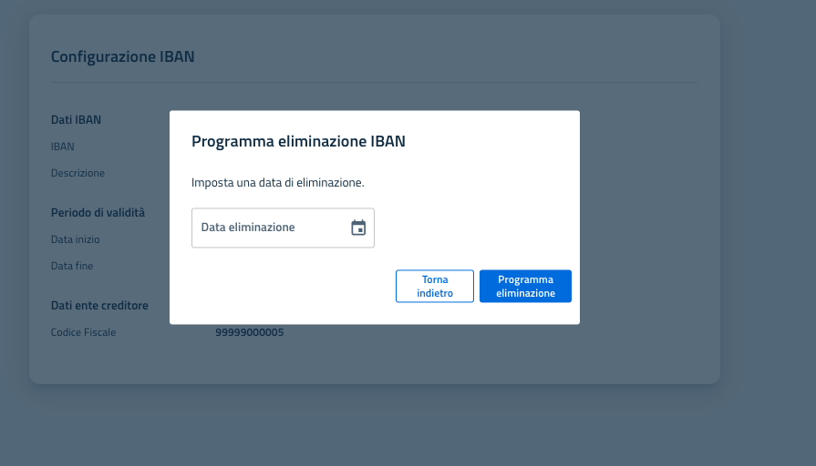 Da qui cliccando sull'apposito bottone "Elimina" l'utente ha la possibilità di definire la data in cui verrà effettuata la cancellazione effettiva dell'IBAN.