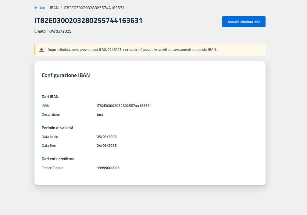 La funzionalità Elimina IBAN è riservata esclusivamente al Referente dei Pagamenti.