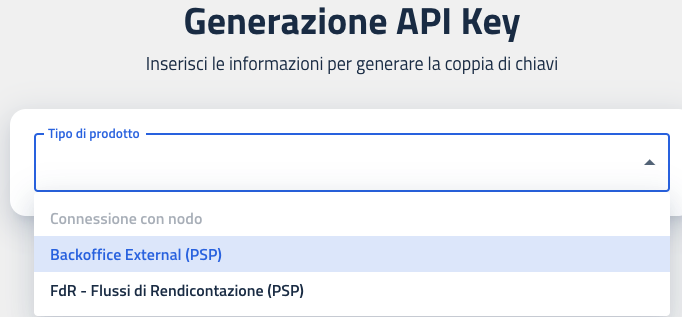 Nella Pagina di Selezione tipo di prodotto, tramite Il menu a tendina “Tipo di prodotto”, è possibile visualizzare e selezionare la tipologia di prodotto per cui è necessario generare le chiavi.