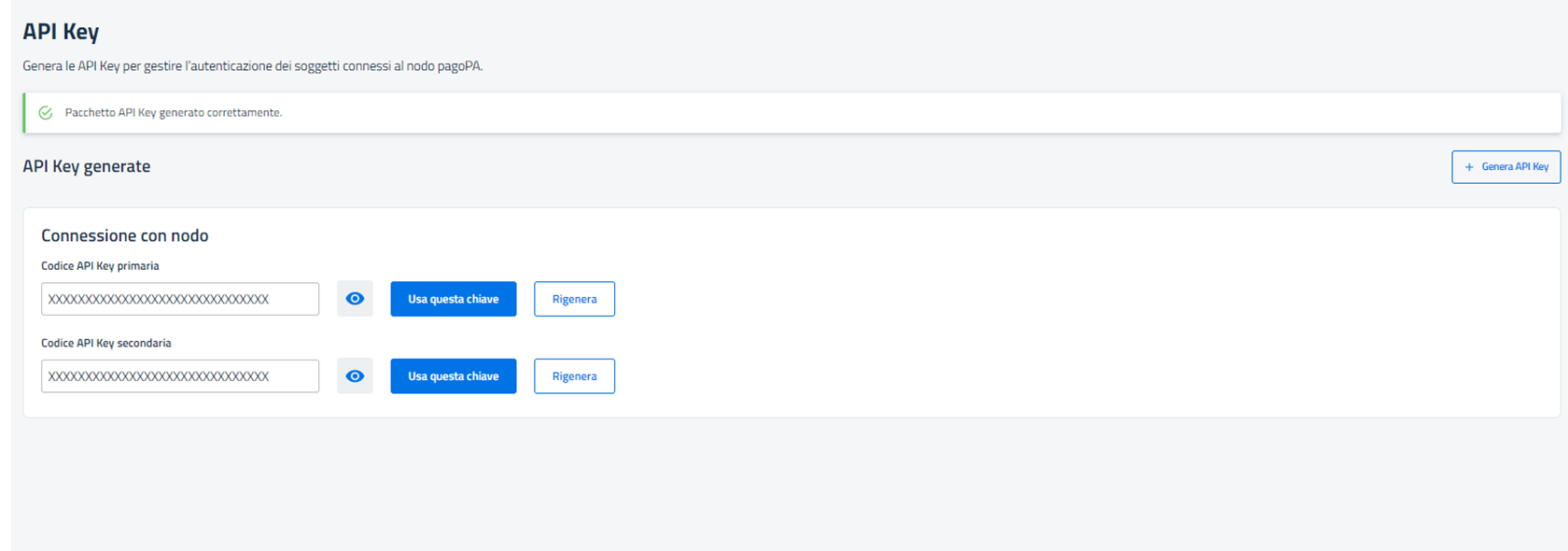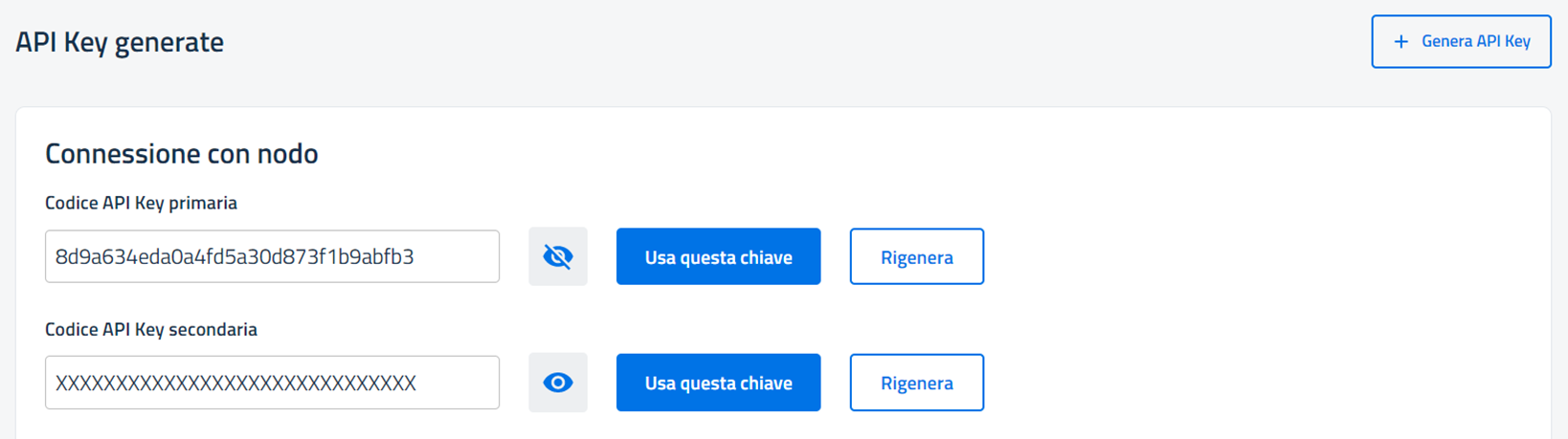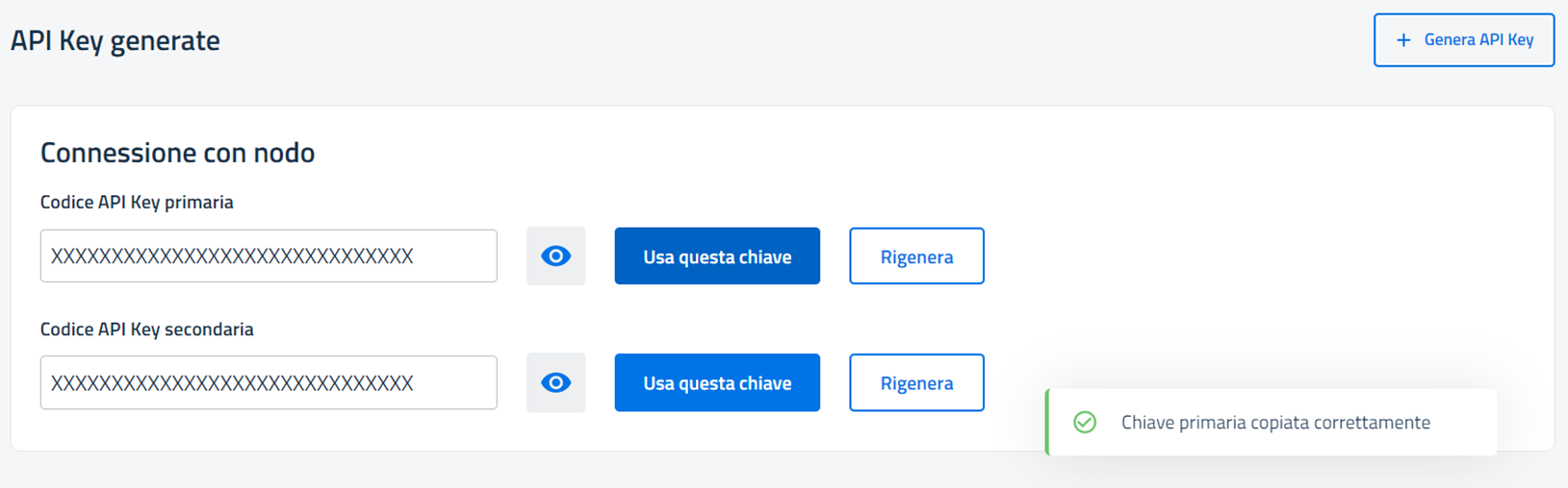 Una volta aver cliccato sul pulsante “Genera API Key”, se la coppia di chiavi (primaria e secondaria) è stata generata correttamente allora è possibile visualizzarle e gestirle all’interno della Pagina Vista API Key.