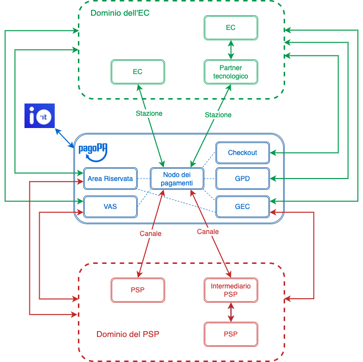 I soggetti aderenti, EC e PSP, si connettono alla piattaforma rispettivamente per mezzo di stazioni e canali, che rappresentano le piattaforme tecnologiche di partner ed intermediari connessi tramite le forme e i metodi descritti nella sezione Connettività.