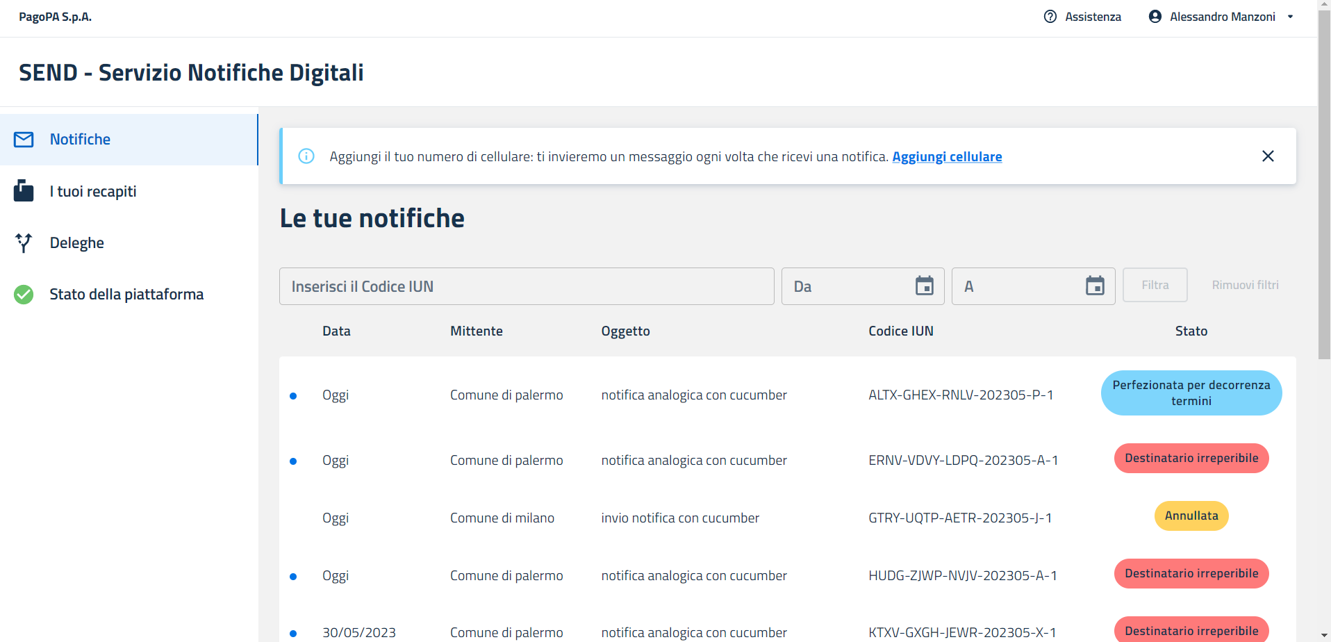 L’utente ha così accesso al portale SEND per gestire le proprie notifiche ed eventualmente quelle a lui delegate. Ha anche la possibilità di configurare i propri recapiti digitali.\