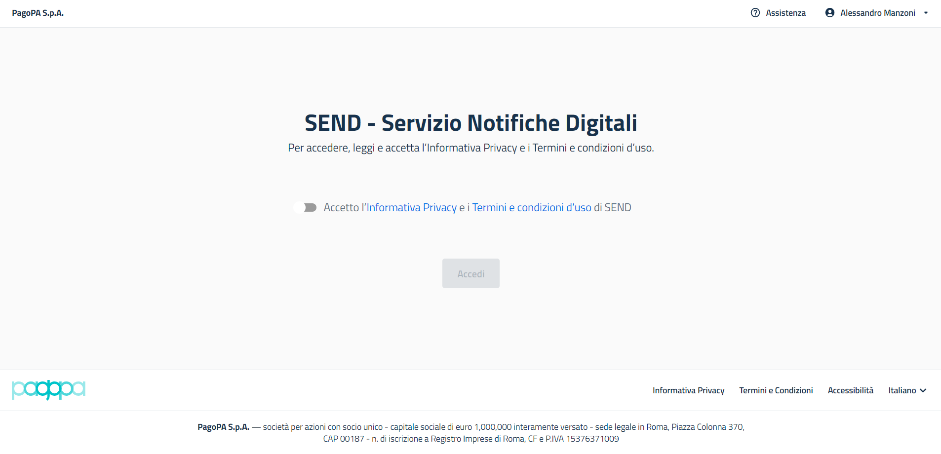 Una persona fisica accede a PN, attraverso il portale SEND all’indirizzo https://cittadini.notifichedigitali.it autenticandosi con la sua identità digitale e confermando la presa visione dei termini di servizio (ToS) e dell’informativa privacy.