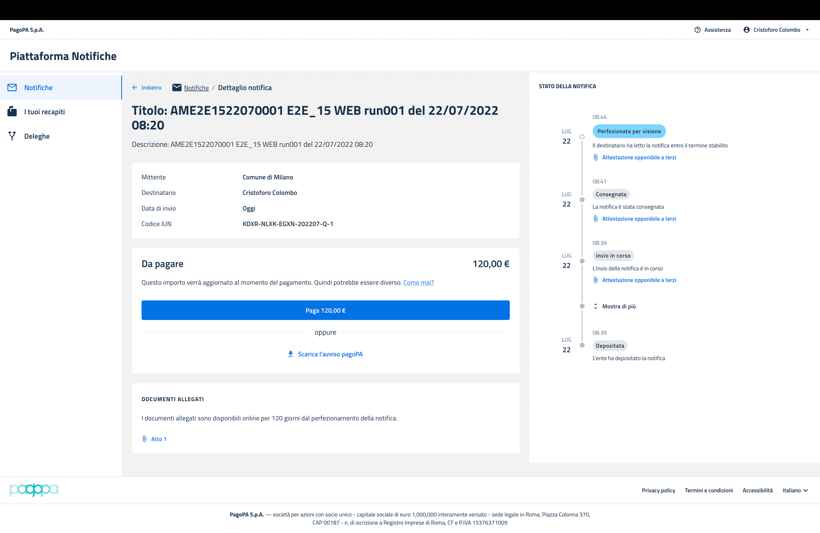 Dettagli di una notifica per il destinatario e/o suo delegato