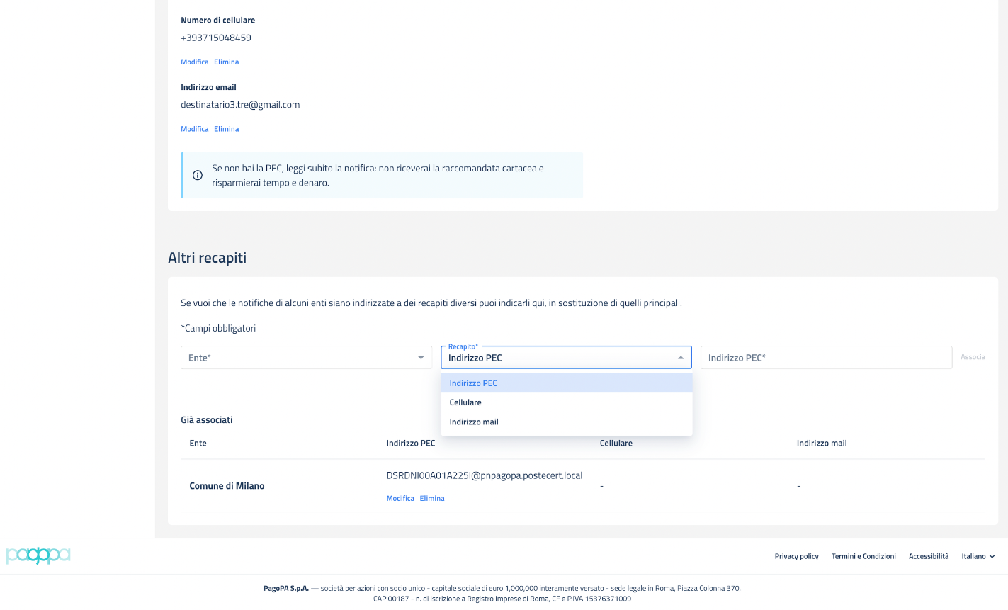 L’utente può indicare ulteriori indirizzi PEC/SERCQ, Email o numero di cellulare da associare alle notifiche provenienti da specifici Enti, che quindi PN userà come recapito esclusivamente per le comunicazioni provenienti da uno di essi. Non è possibile configurare più indirizzi dello stesso tipo per lo stesso ente.