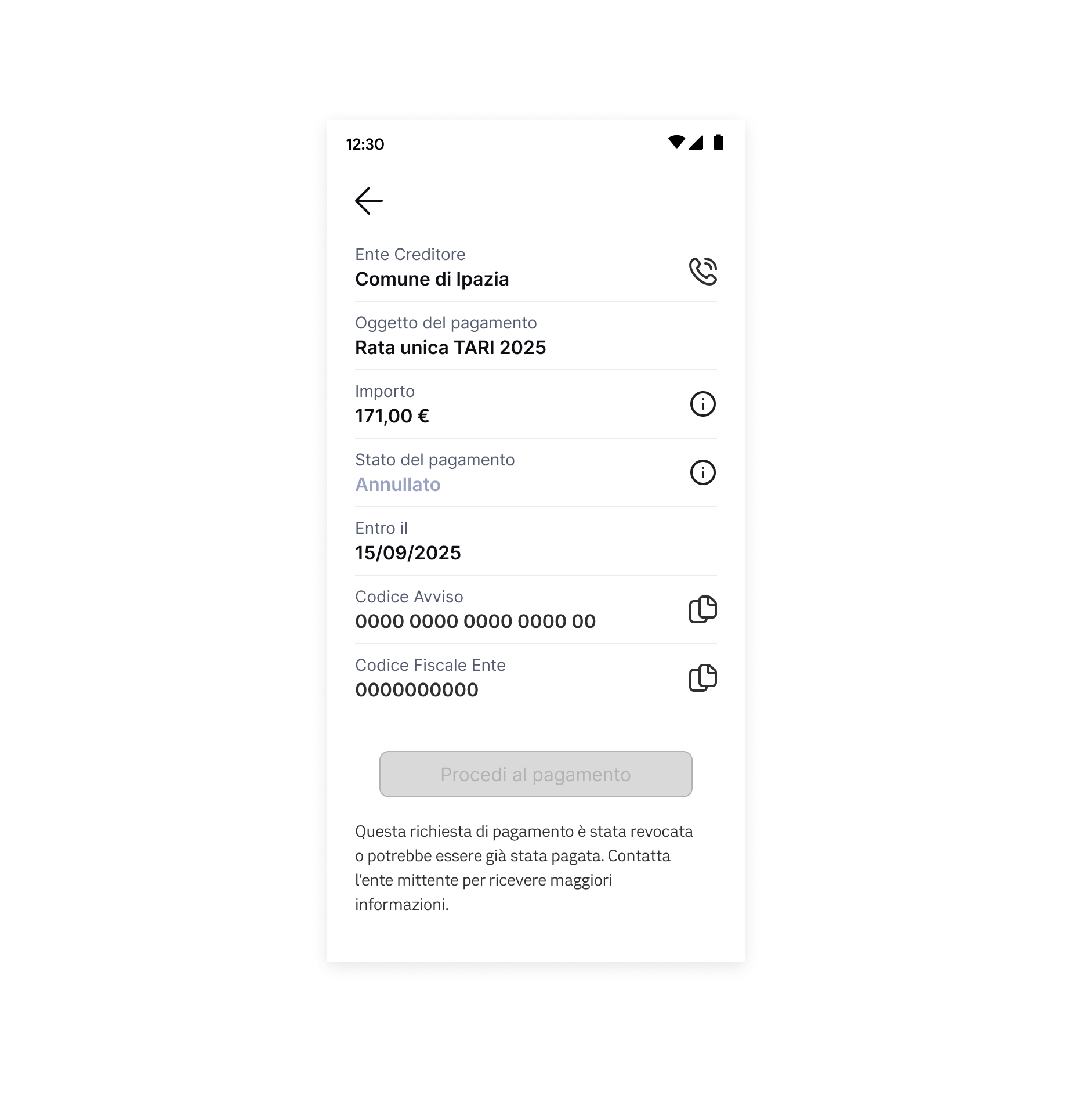 Questo stato si verifica quando una richiesta di pagamento viene annullata dall'ente. Può succedere per diversi motivi: l'ente può averla revocata o l'utente potrebbe averla pagata su altri canali.